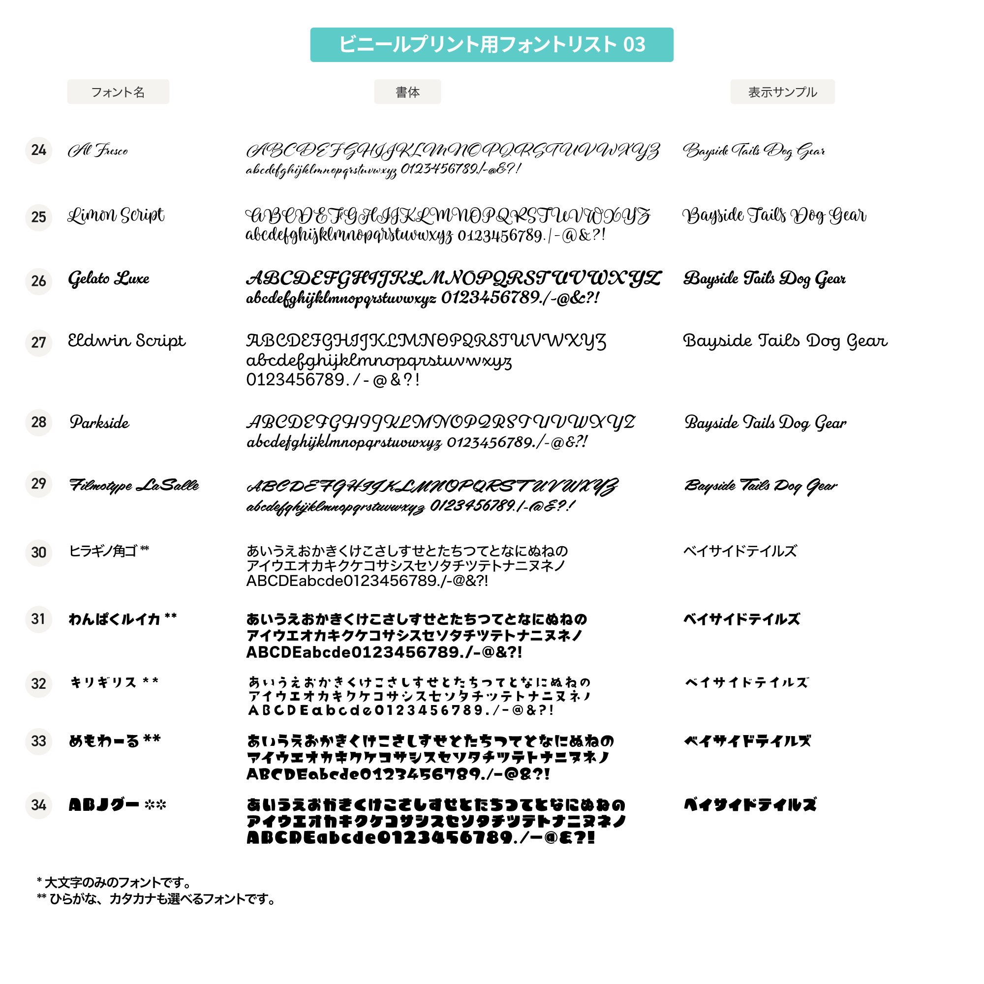 ローマ字大文字・小文字、数字、記号、ひらがな*、カタカナ*